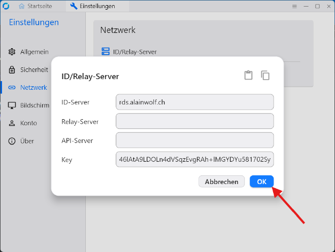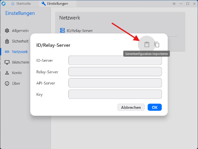Zurück in der RustDesk-Konfiguration, klicke auf das Klemmbrett-Symbol im Dialogfenster.